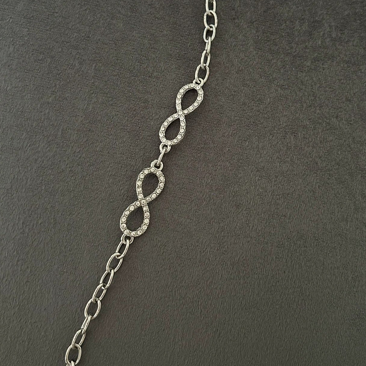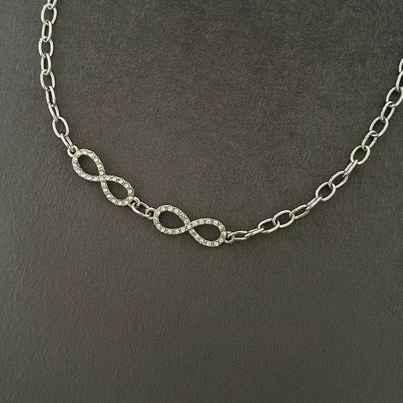 Ett trendigt smycke med kedja i silvernyans med två evighetssymboler försedda med trass-stenar.